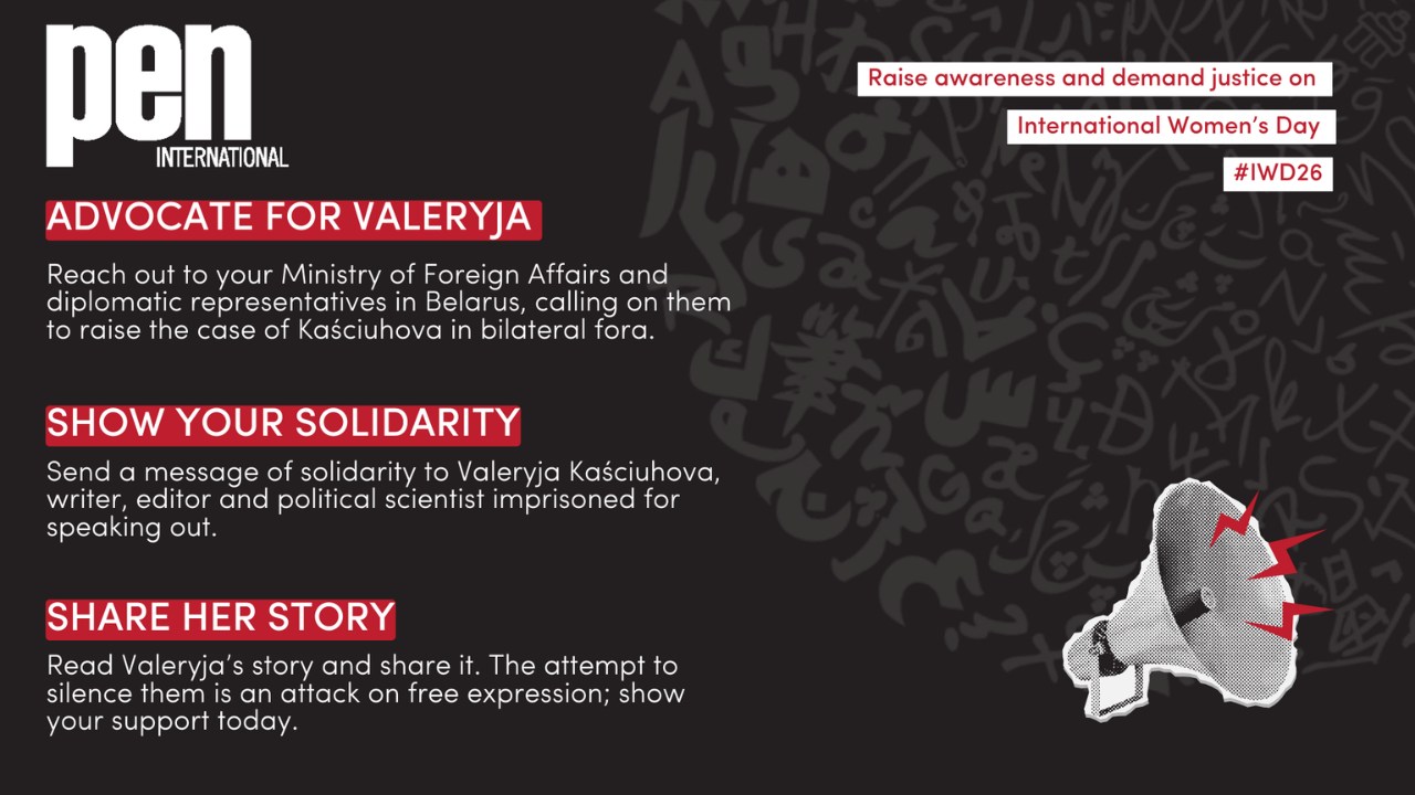 Spread the word about Valeryja Kaściuhova’s case on social media. Use the hashtags # Valeryja Kaściuhova, #IWD26 and #InternationalWomensDay, tagging @peninternational (Instagram), facebook.com/peninternational (Facebook) and @peninternational.bsky.social (Bluesky).